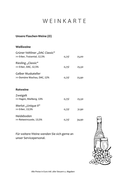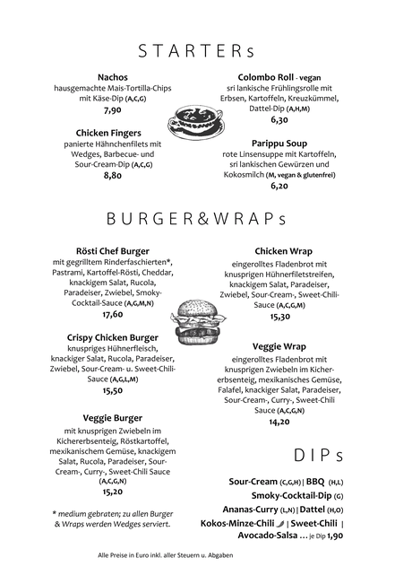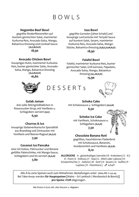 Zusätzlich zur unten angeführten Speisekarte gibt es variierende "Specials", über welche wir Euch gerne vor Ort informieren. Lasst Euch überraschen!